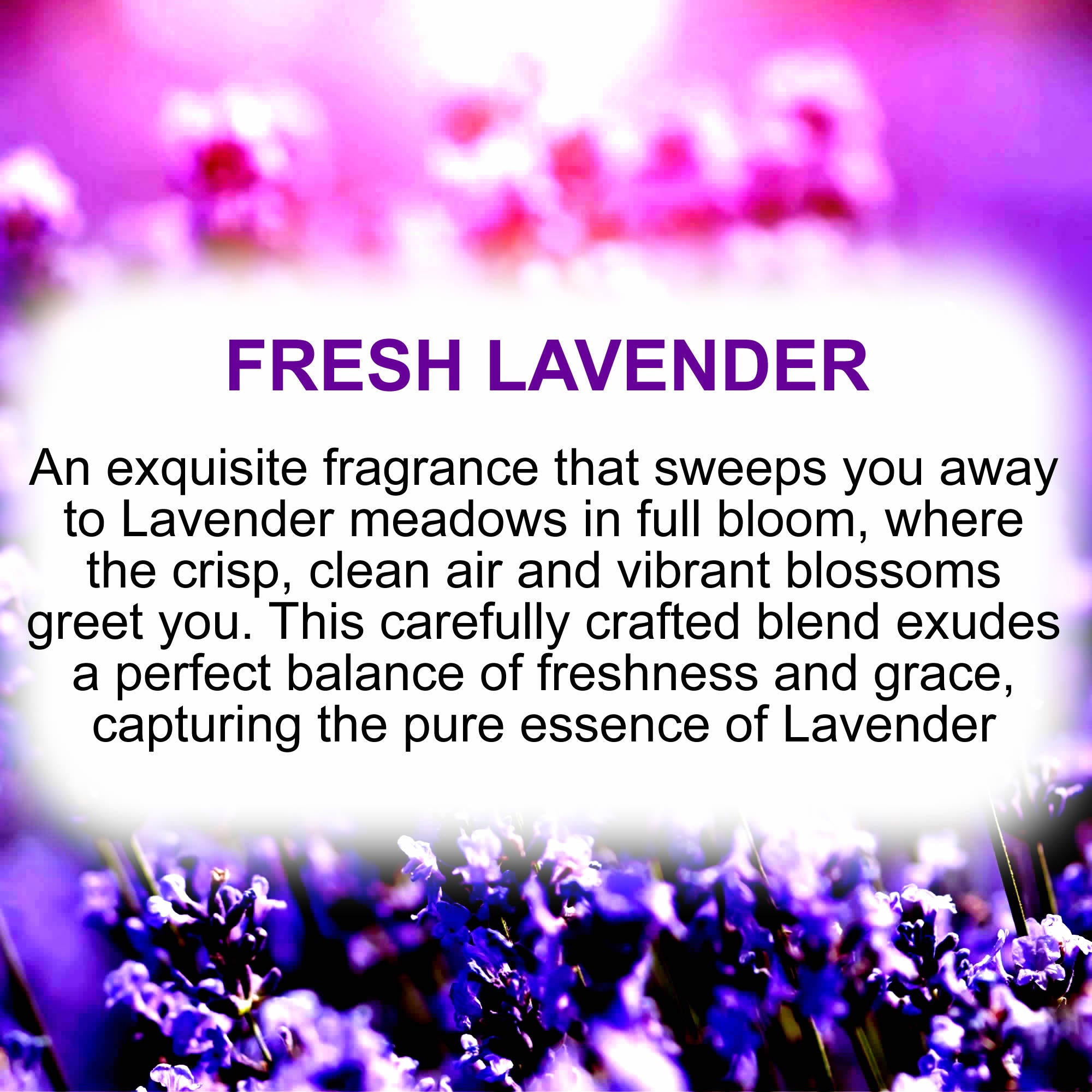 An exquisite fragrance that sweeps you away to expansive Lavender meadows in full bloom, where the crisp, clean air and vibrant blossoms greet you. This carefully crafted blend exudes a perfect balance of freshness and grace, capturing the pure essence of Lavender