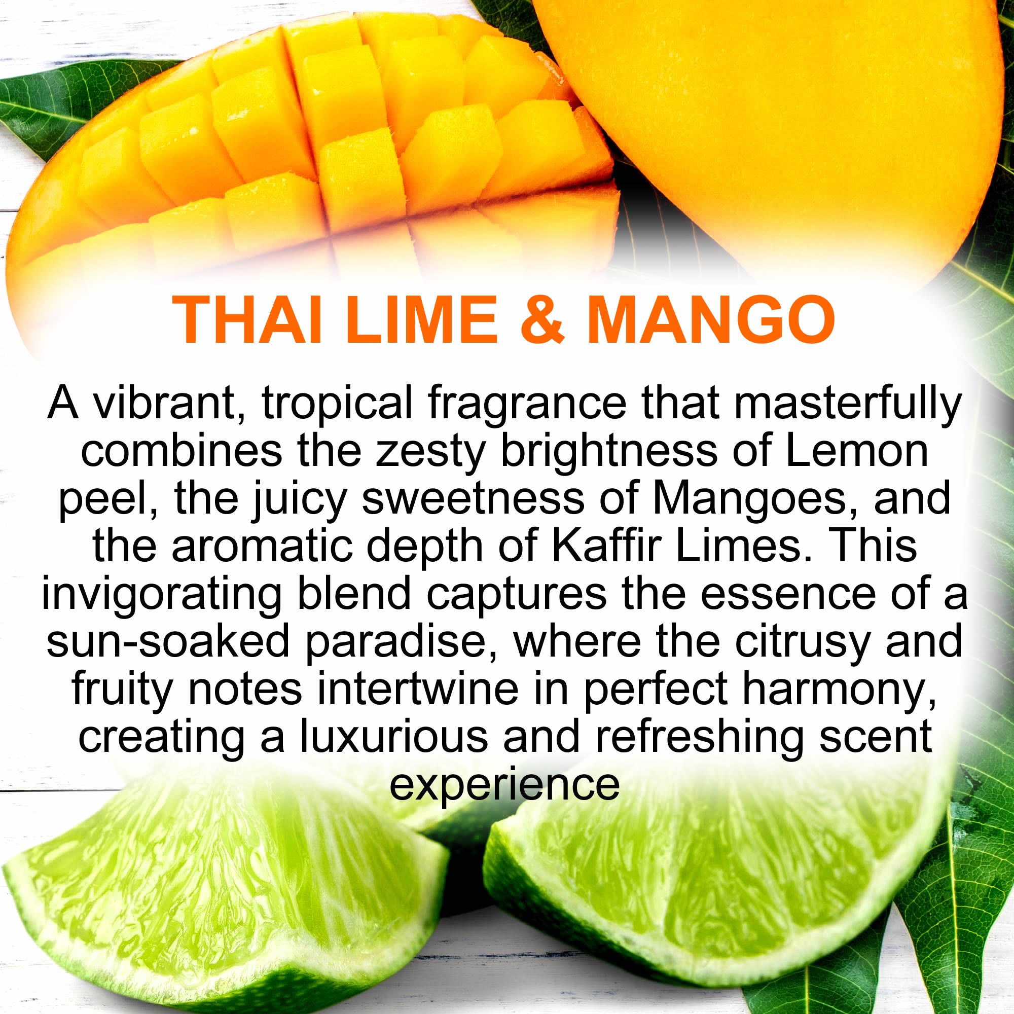 A vibrant, tropical fragrance that masterfully combines the zesty brightness of Lemon peel, the juicy sweetness of Mangoes, and the aromatic depth of Kaffir Limes. This invigorating blend captures the essence of a sun-soaked paradise, where the citrusy and fruity notes intertwine in perfect harmony, creating a luxurious and refreshing scent experience