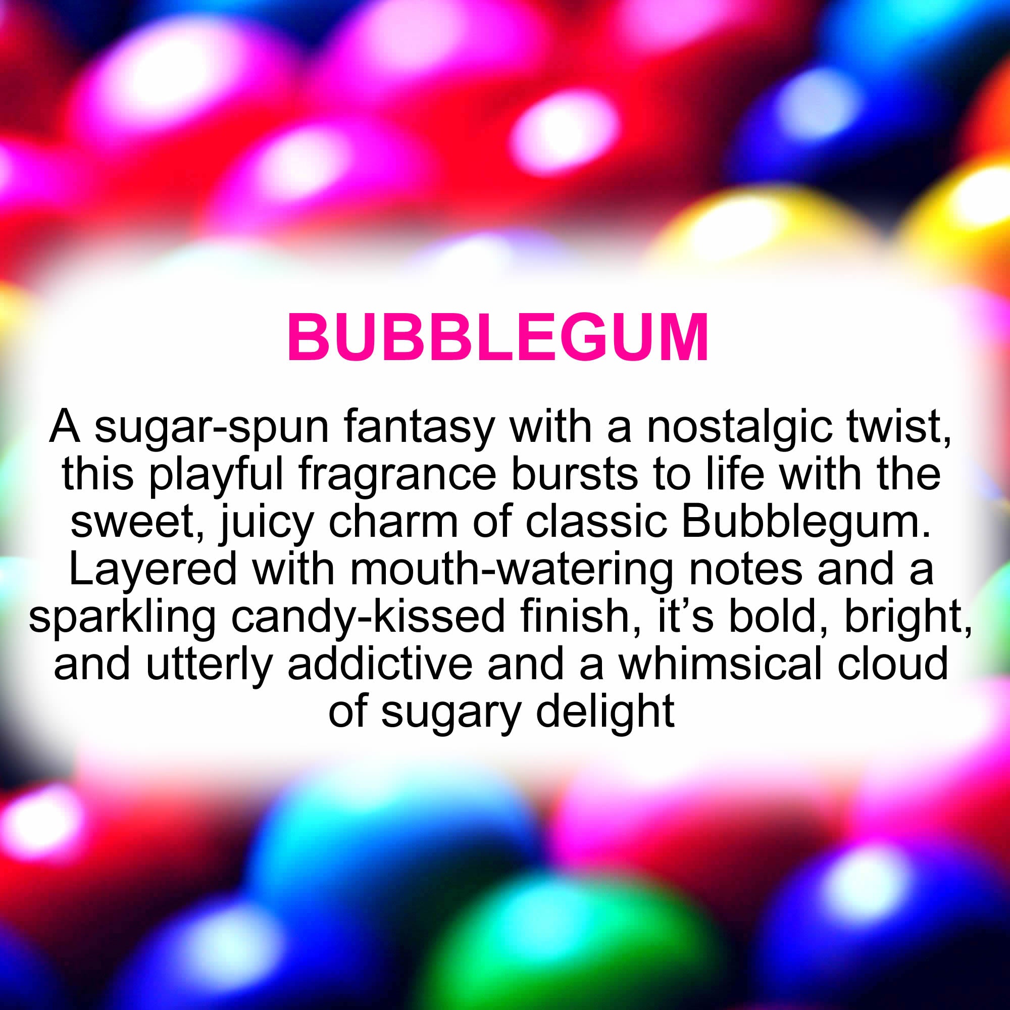 A sugar-spun fantasy with a nostalgic twist, this playful fragrance bursts to life with the sweet, juicy charm of classic Bubblegum. Layered with mouth-watering notes and a sparkling candy-kissed finish, it’s bold, bright, and utterly addictive and a whimsical cloud of sugary delight