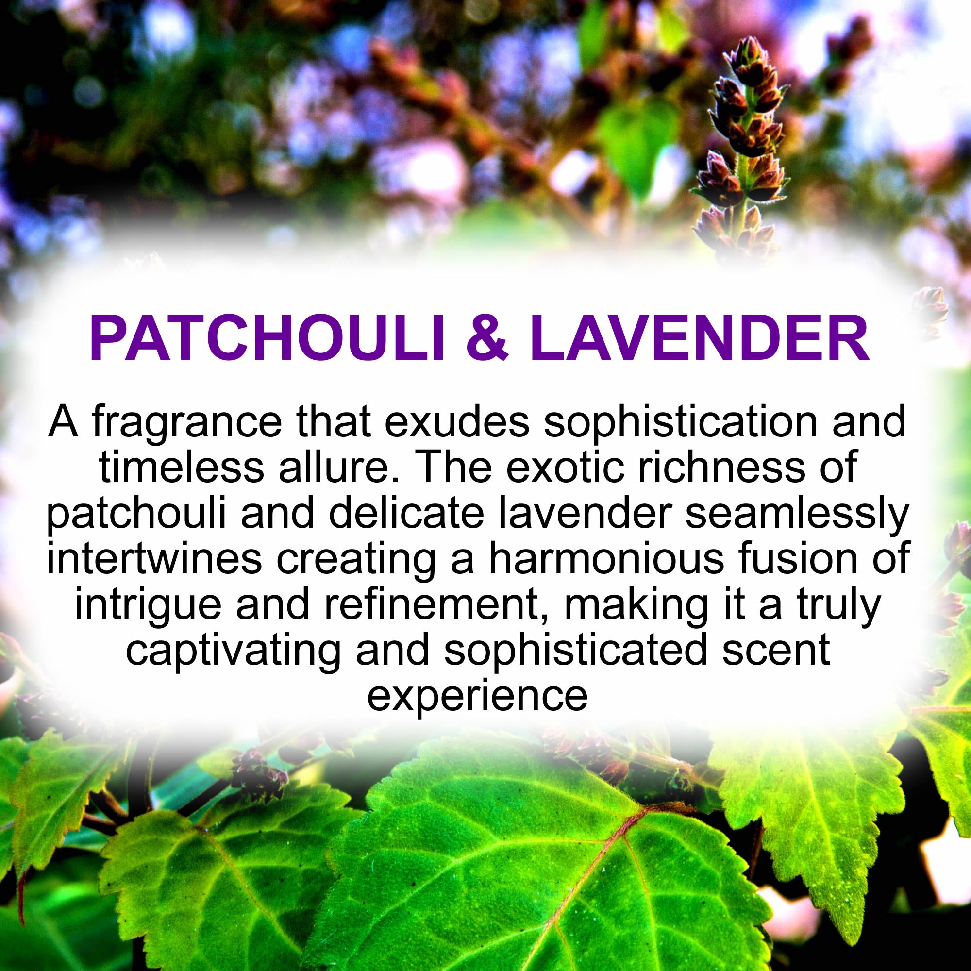 A fragrance that exudes sophistication and timeless allure. The exotic richness of patchouli and delicate lavender seamlessly intertwines creating a harmonious fusion of intrigue and refinement, making it a truly captivating and sophisticated scent experience