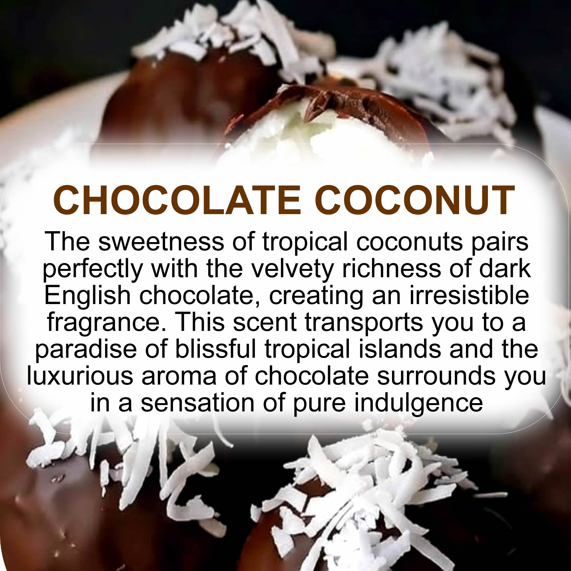 The sweetness of tropical coconuts pairs perfectly with the velvety richness of dark English chocolate, creating an irresistible fragrance. This scent transports you to a paradise of blissful tropical islands and the luxurious aroma of chocolate surrounds you in a sensation of pure indulgence