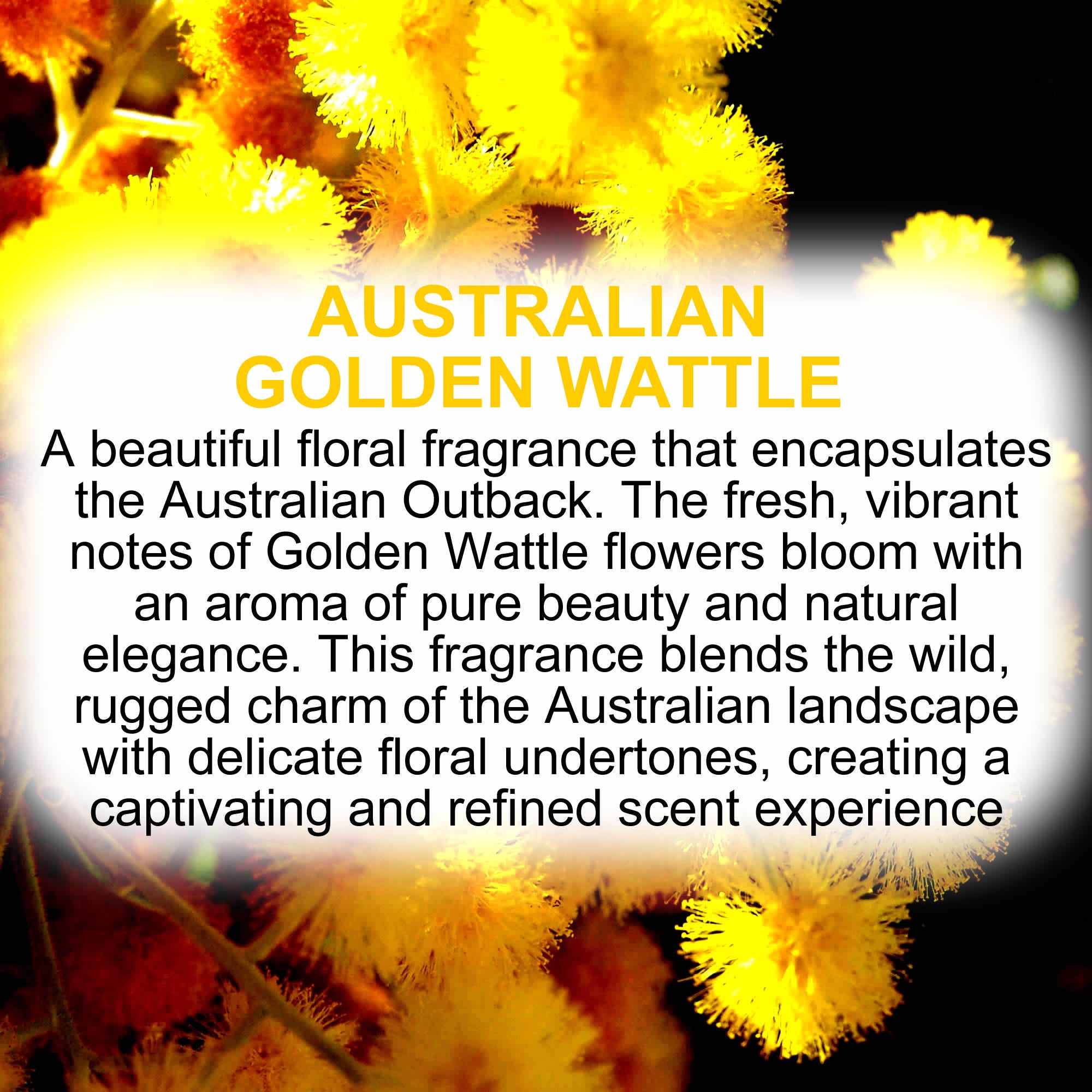 A beautiful floral fragrance that encapsulates the Australian Outback. The fresh, vibrant notes of Golden Wattle flowers bloom with an aroma of pure beauty and natural elegance. This fragrance blends the wild, rugged charm of the Australian landscape with delicate floral undertones, creating a captivating and refined scent experience