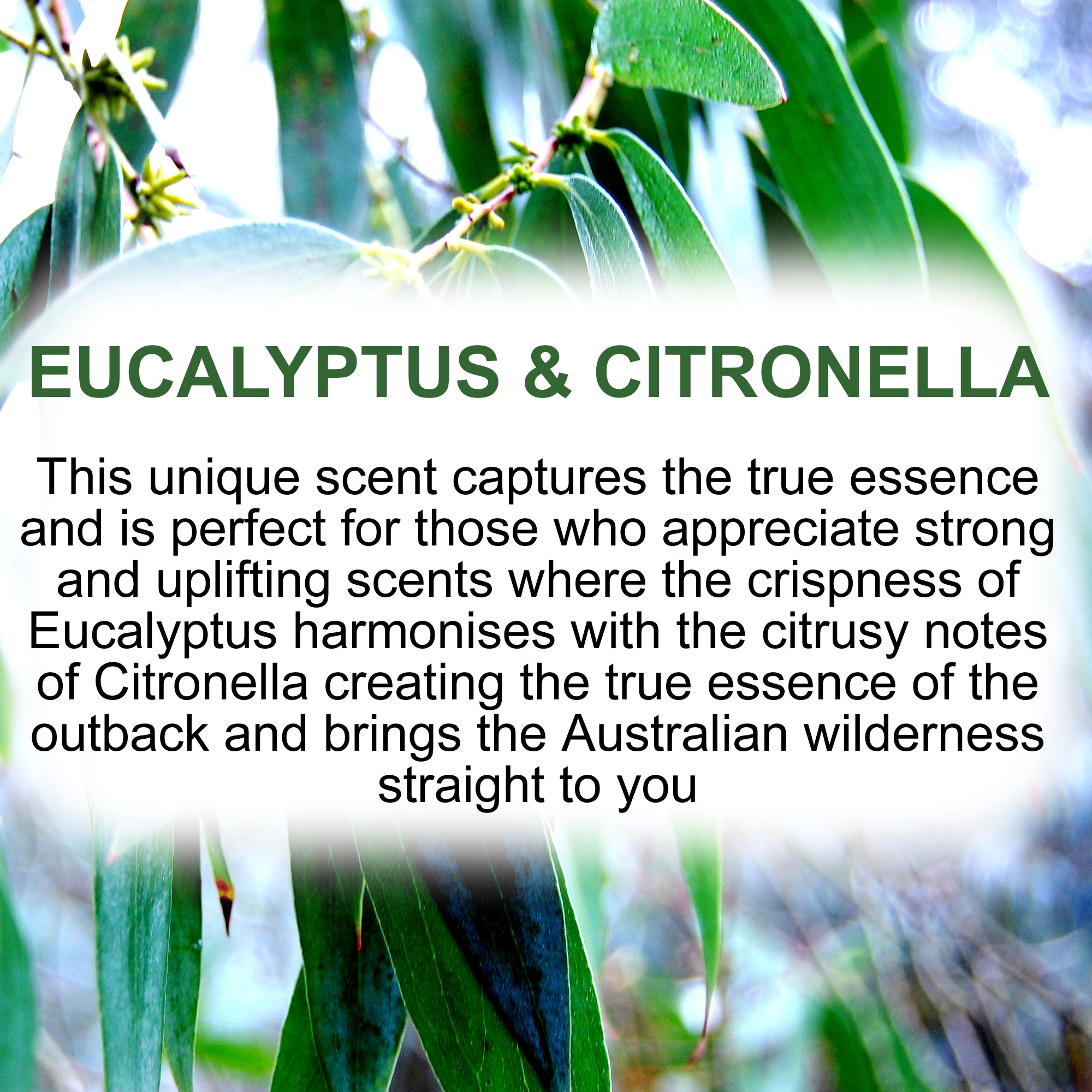 This unique scent captures the true essence and is perfect for those who appreciate strong and uplifting scents where the crispness of Eucalyptus harmonises with the citrusy notes of Citronella creating the true essence of the outback and brings the Australian wilderness straight to you