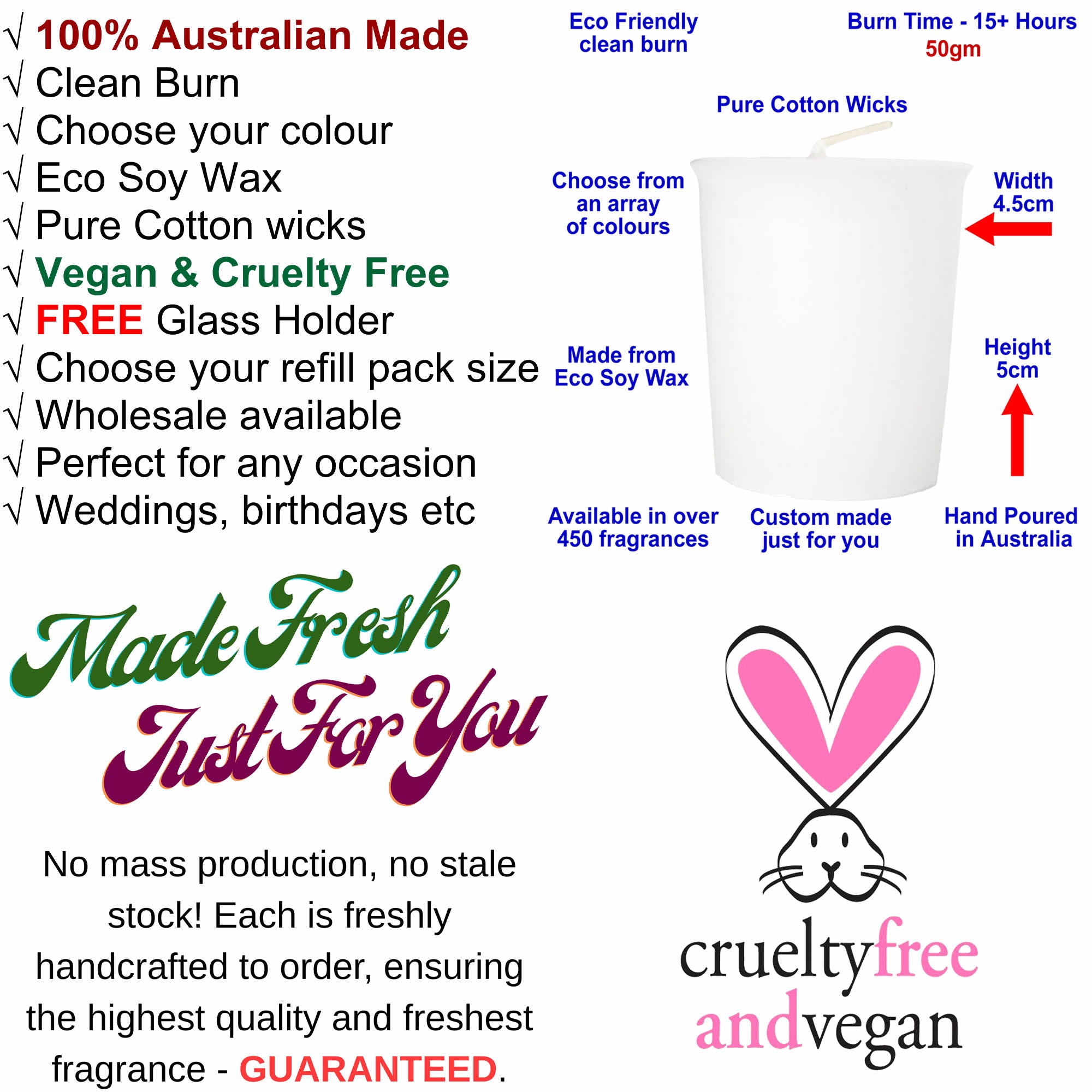 Votive candles are designed to be used in the provided glass holder and should never be burned standalone. Always use the glass holder to maximize safety and achieve the best burn experience.