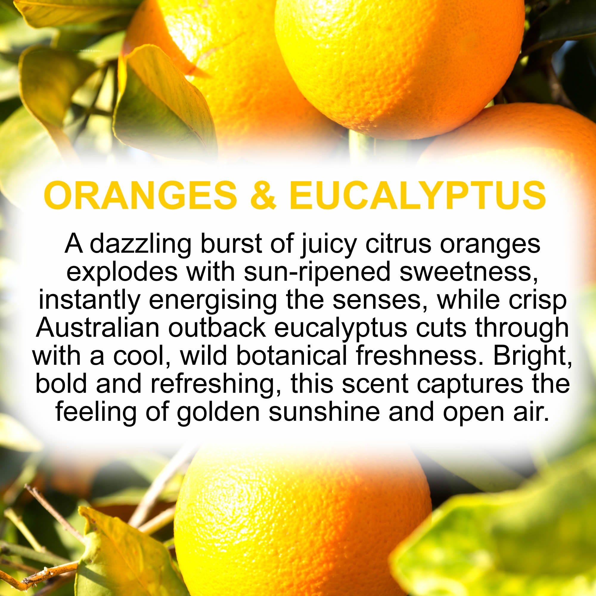 A dazzling burst of juicy citrus oranges explodes with sun-ripened sweetness, instantly energising the senses, while crisp Australian outback eucalyptus cuts through with a cool, wild botanical freshness. Bright, bold and unmistakably refreshing, this scent captures the feeling of golden sunshine and open air — clean, invigorating and beautifully alive.