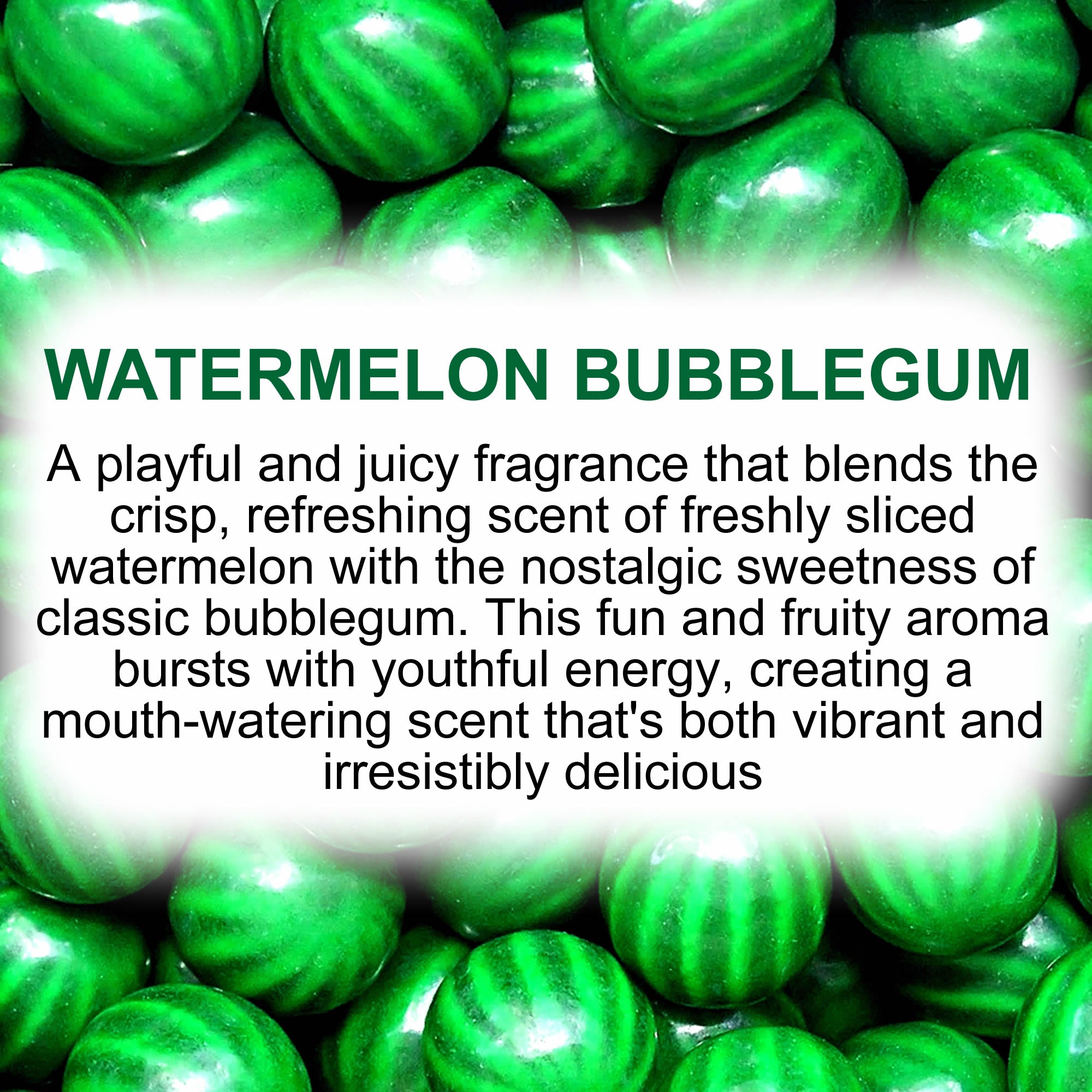 A playful and juicy fragrance that blends the crisp, refreshing scent of freshly sliced watermelon with the nostalgic sweetness of classic bubblegum. This fun and fruity aroma bursts with youthful energy, creating a mouth-watering scent that's both vibrant and irresistibly delicious