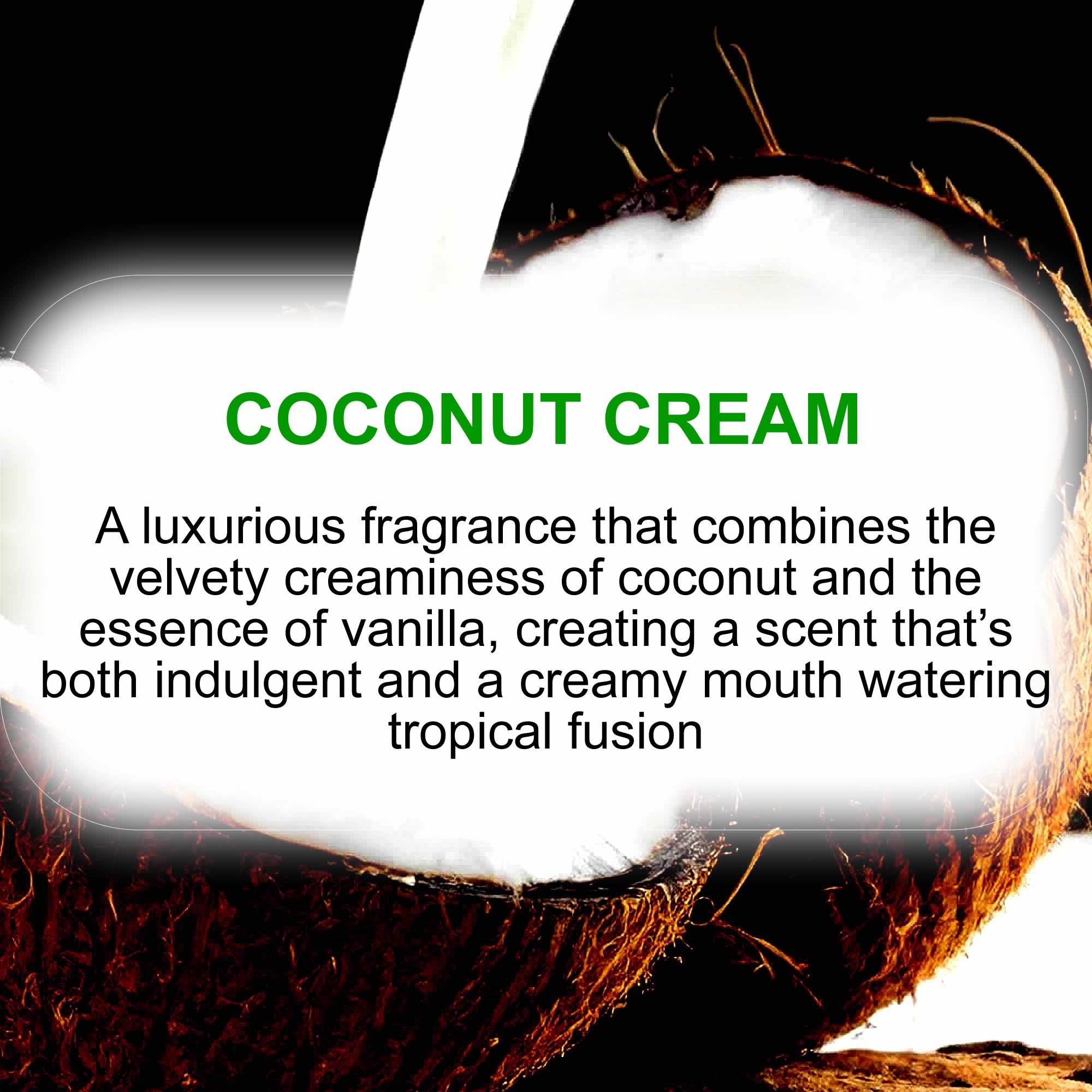 A luxurious fragrance that combines the velvety creaminess of coconut and the essence of vanilla, creating a scent that’s both indulgent and a creamy mouth watering tropical fusion