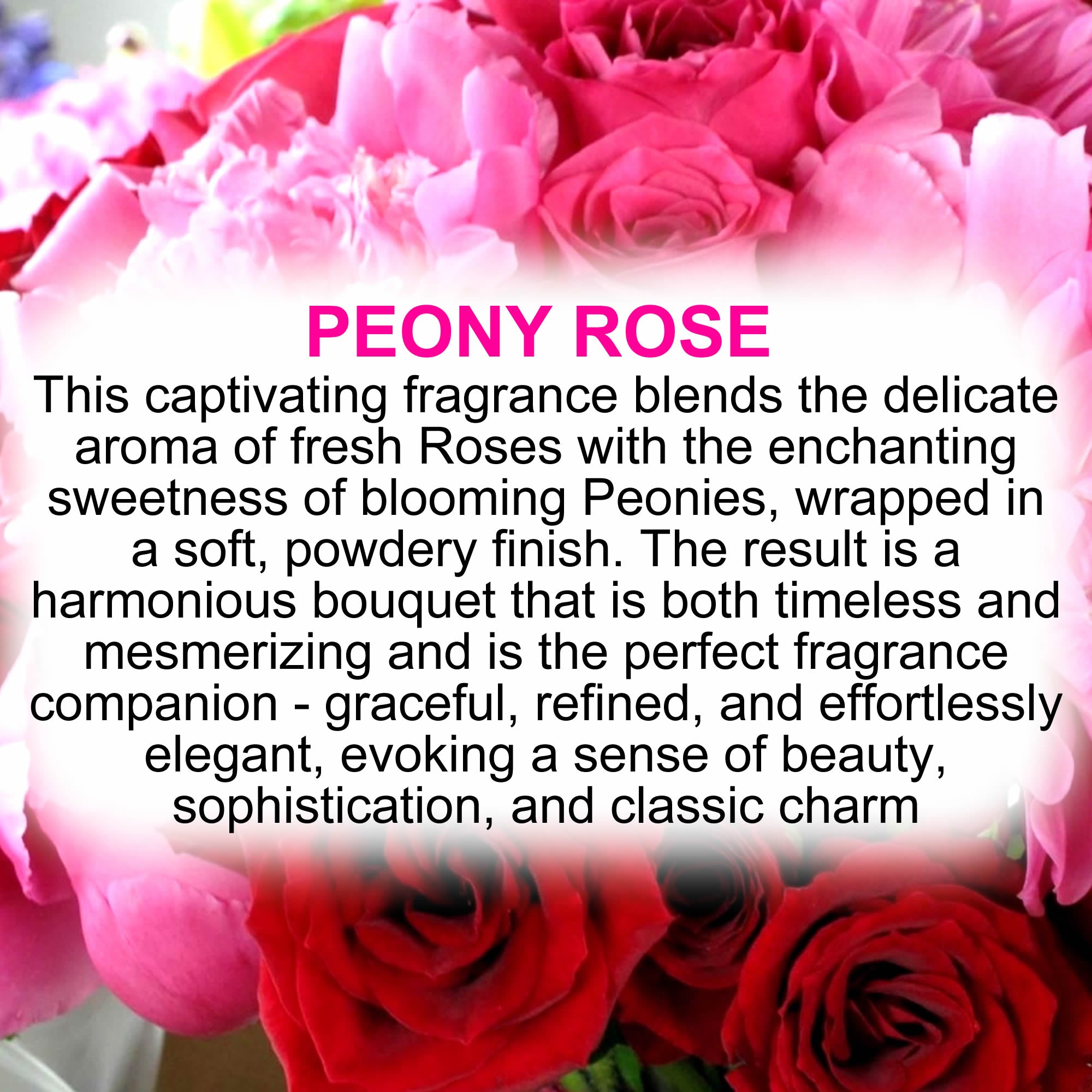 This captivating fragrance blends the delicate aroma of fresh Roses with the enchanting sweetness of blooming Peonies, wrapped in a soft, powdery finish. The result is a harmonious bouquet that is both timeless and mesmerizing and is the perfect fragrance companion - graceful, refined, and effortlessly elegant, evoking a sense of beauty, sophistication, and classic charm