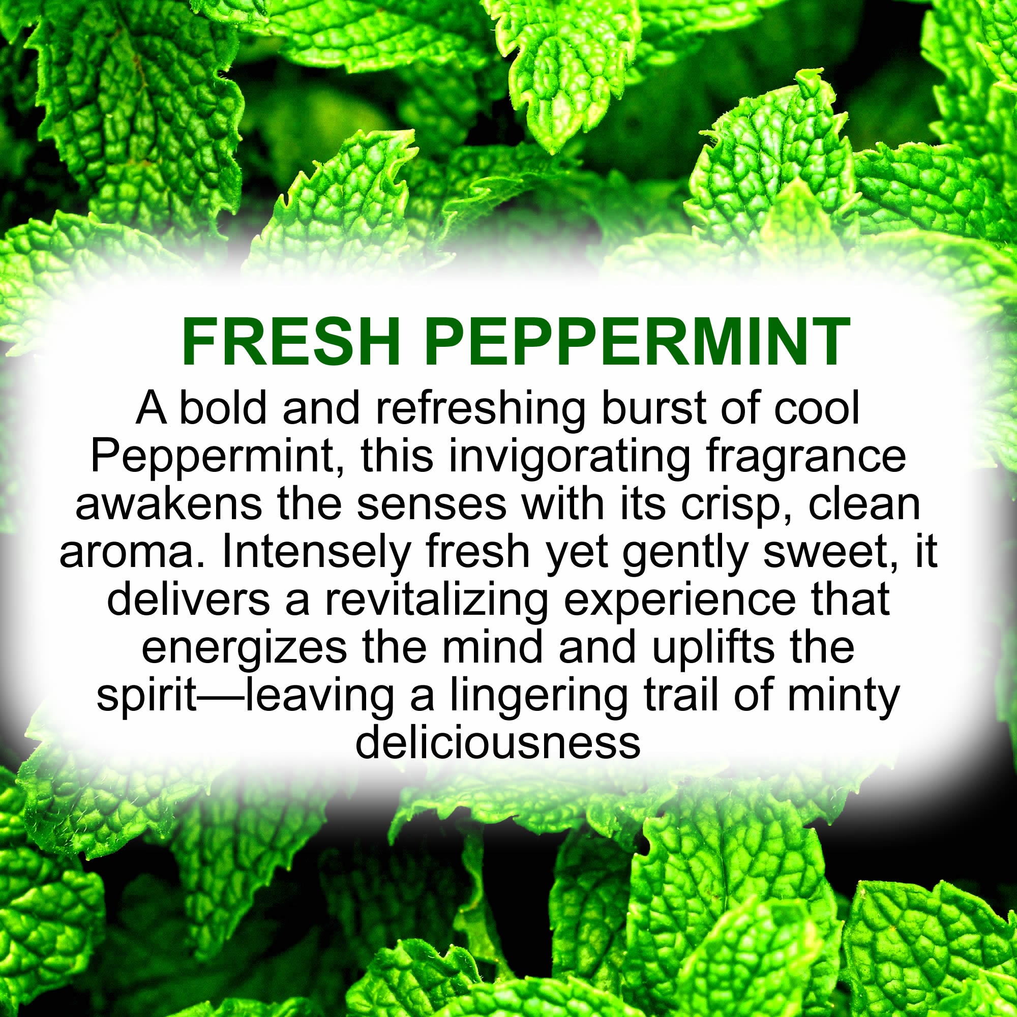 A bold and refreshing burst of cool Peppermint, this invigorating fragrance awakens the senses with its crisp, clean aroma. Intensely fresh yet gently sweet, it delivers a revitalizing experience that energizes the mind and uplifts the spirit—leaving a lingering trail of minty deliciousness