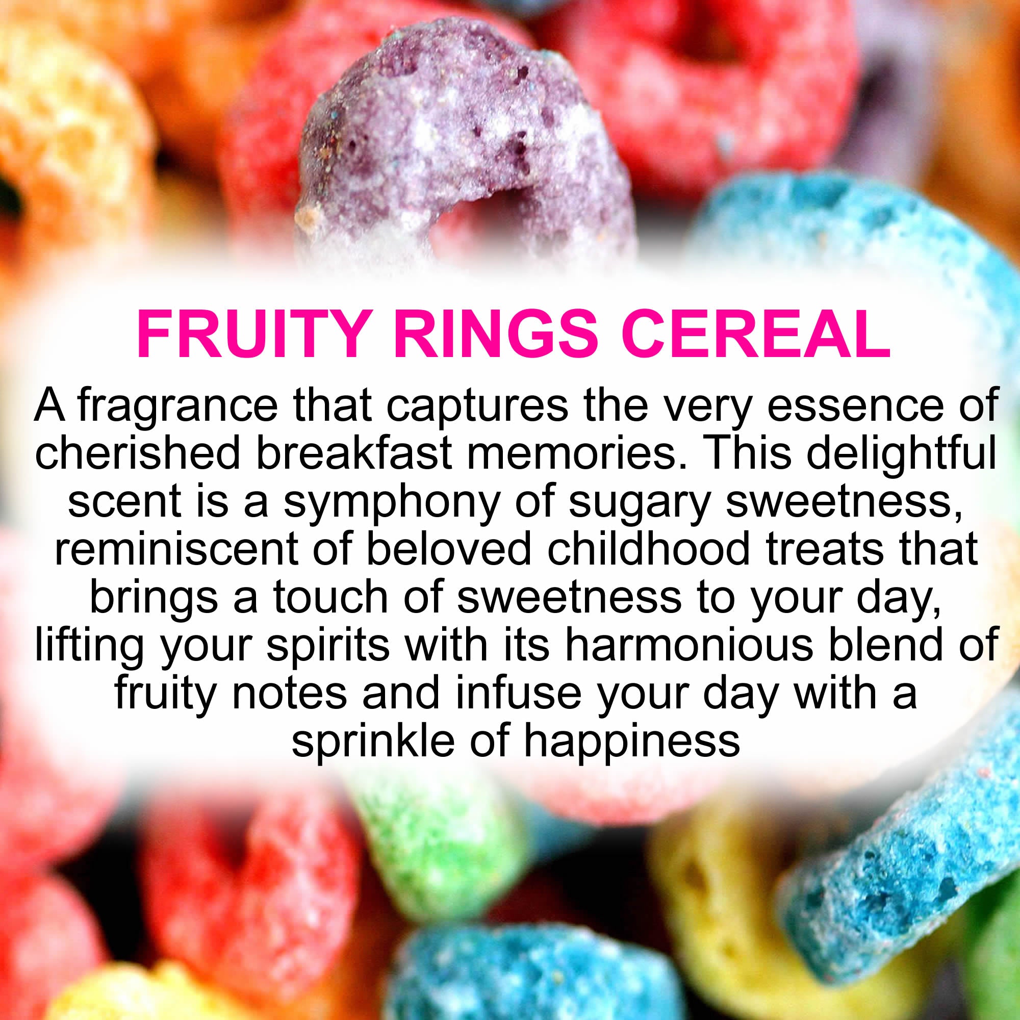 A fragrance that captures the very essence of cherished breakfast memories. This delightful scent is a symphony of sugary sweetness, reminiscent of beloved childhood treats that brings a touch of sweetness to your day, lifting your spirits with its harmonious blend of fruity notes and infuse your day with a sprinkle of happiness